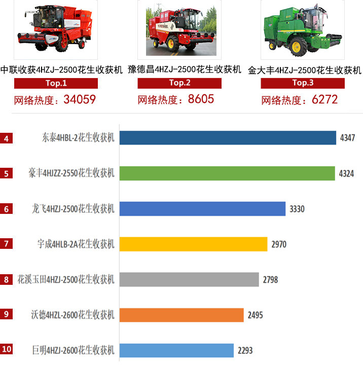 在2019年花生收獲機產(chǎn)品網(wǎng)絡(luò)熱度排行榜中,中聯(lián)收獲4HZJ-2500花生收獲機以3.4萬人的關(guān)注度獲得名。
